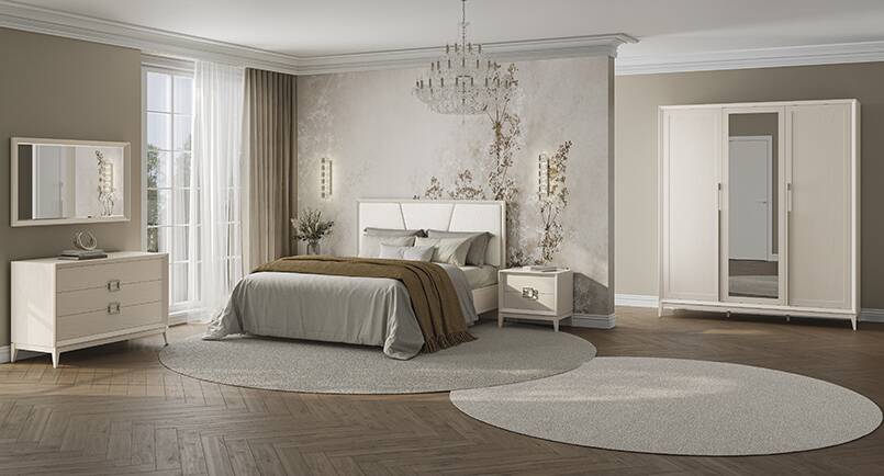 Особое внимание уделено кровати с высокой головной спинкой, декорированной фактурной тканью с 3D-эффектом.