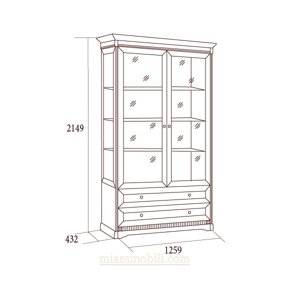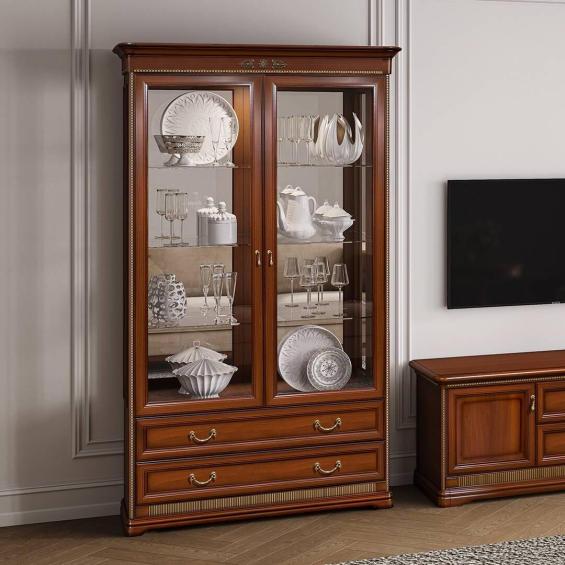 Мебель выполнена в цвете орех и отделана легкой патиной. В верхней части шкафа установлена подсветка, задняя стенка зеркальная. Фасад декорирован накладными элементами.